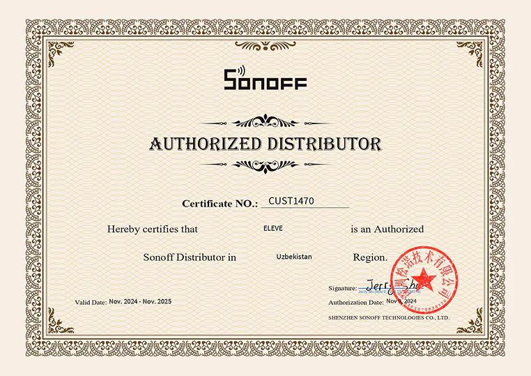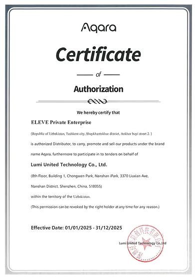 We are official distributor smart devices Aqara, Sonoff and Moes in Uzbekistan Why choose us Individual approach and flexiblesolutions in every project Official distributor Only original productsfrom manufacturers Expertise Professional advice and support Individual approach We select solutions to suit your needs Quality and reliability We work with trusted manufacturers Our certificates Documents confirmingofficial cooperation Our brands Brands that talk for themselves Our clients Satisfied clients -best recommendation Become ours dealer Individual approach and flexiblesuggestions in every case Become a dealer