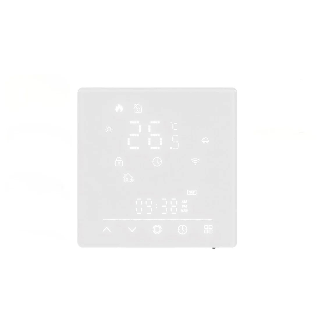Доступный в трех моделях, предназначенных для различных систем отопления — водяного, электрического и бойлерного — этот термостат отвечает разнообразным потребностям, улучшая эстетику вашего дома. Гладкая стеклянная панель придает вашему помещению нотку элегантности и изысканности, сочетая функциональность со стилем.